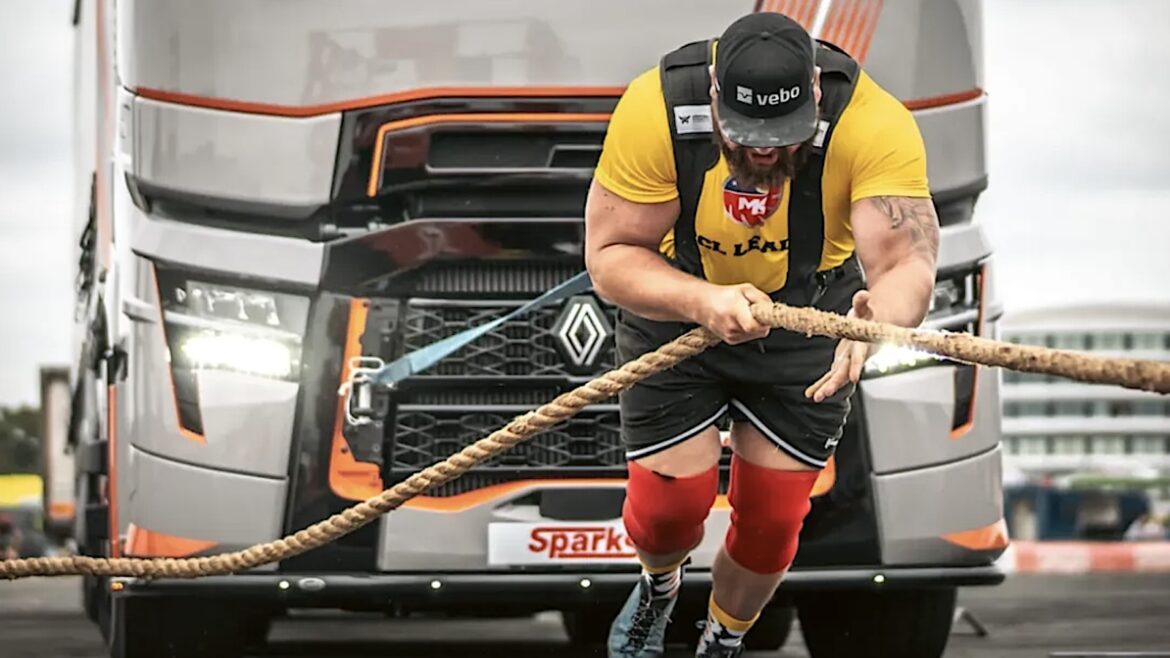 Each strongman pulled a 15,000-kilogram vehicle 25 meters for time.