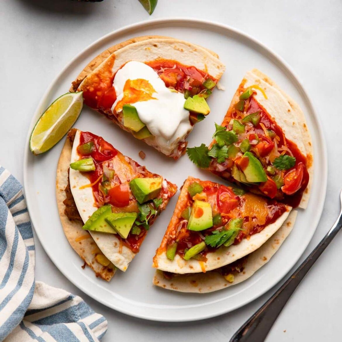 As for toppings? Sour cream, cilantro, shredded cheese, tortilla chips, sliced jalapeño pepper, green onions, or lime wedges all make perfect additions.