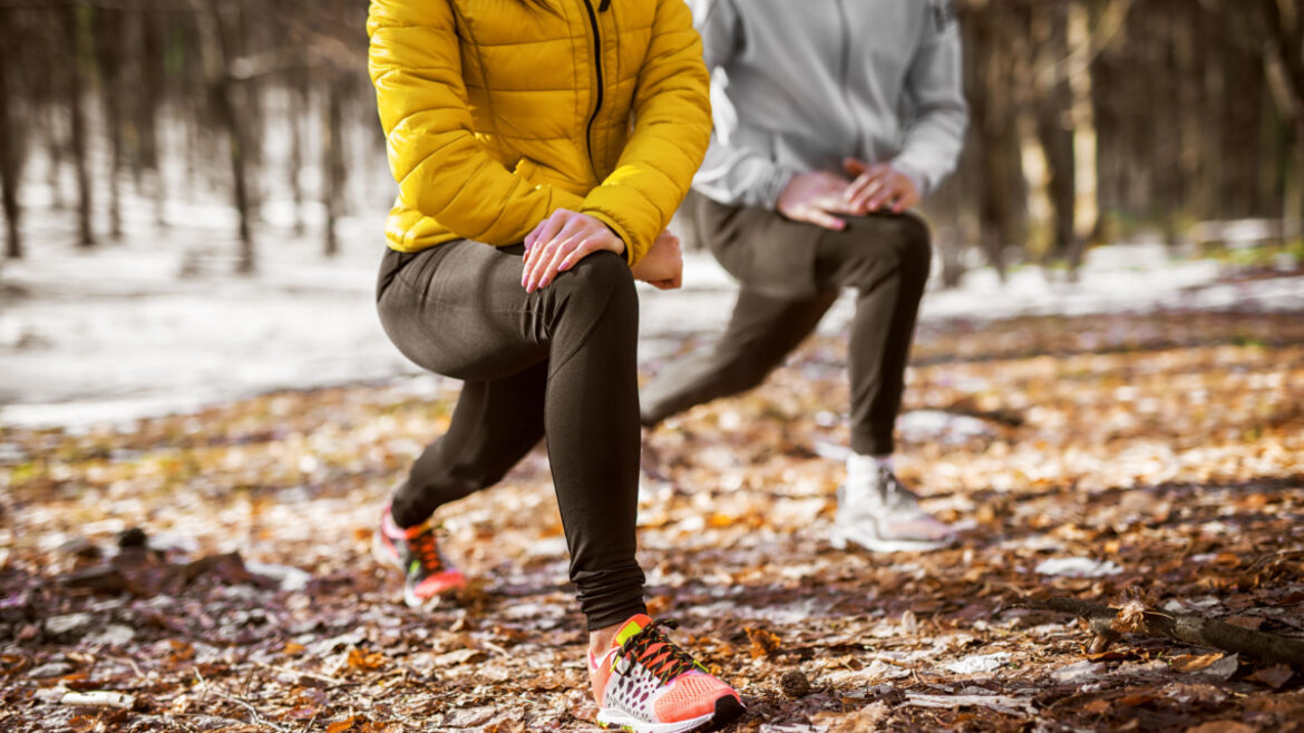 Pair of exercisers perform lunges outdoors in wintry settingPair of exercisers perform lunges outdoors in wintry setting