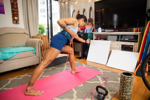 3. Place one end of a long-looped resistance band underneath your right foot and grab the other end with your left hand.