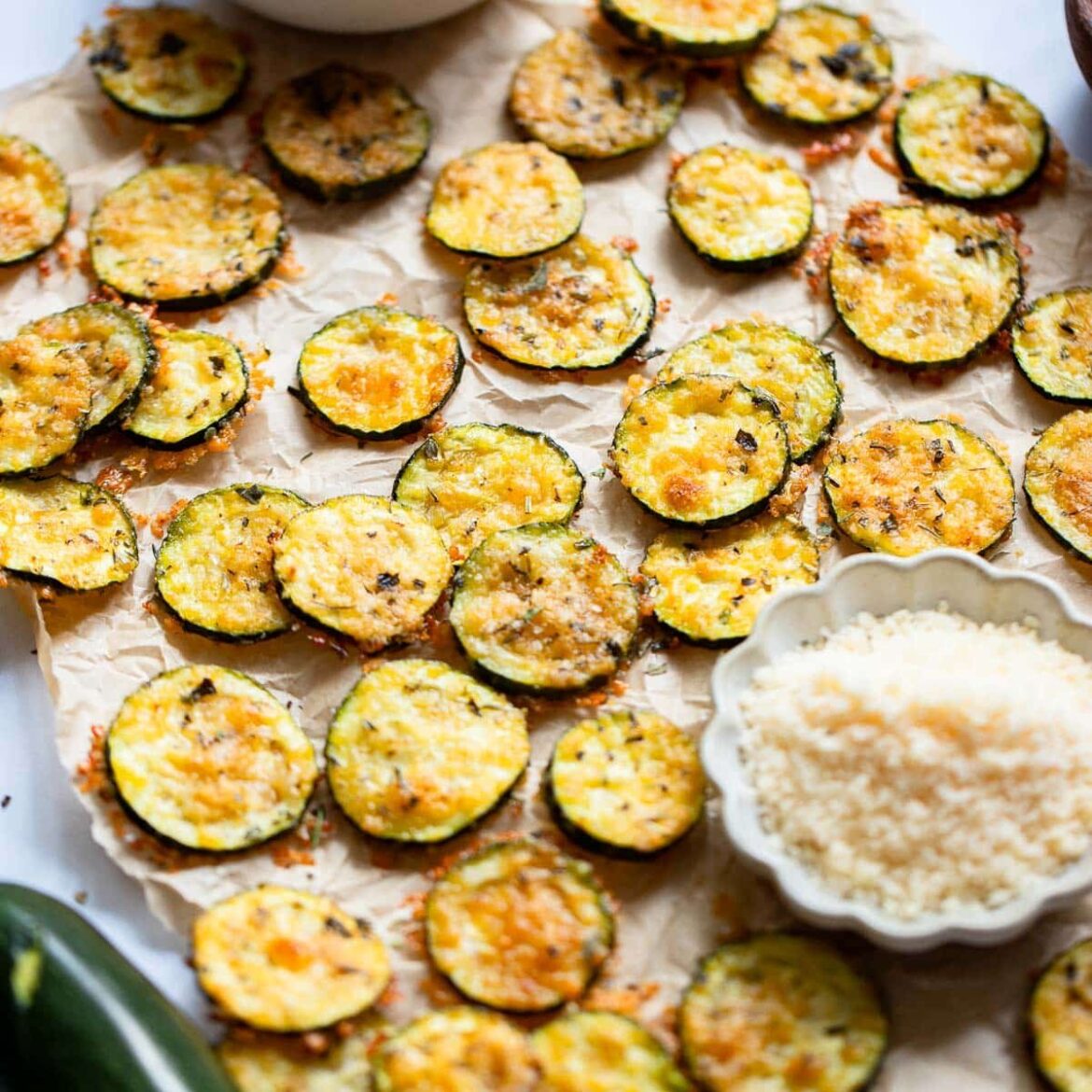 Are these the same as snacking on potato chips? Of course not, but they are incredibly delicious as the parmesan cheese creates a crisp outer layer around the tender center of the roasted zucchini slices.
