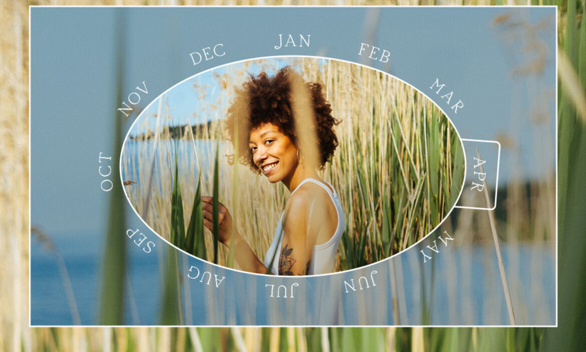 April Monthly Horoscope frame featuring woman with textured hair in reeds by water