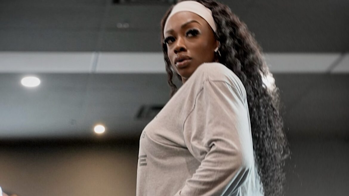 Grant moved slowly through Bulgarian split squats, paying close attention to her mind-muscle connection. Grant draws on her gymnastic and ballet experience to assist with stability and balance.